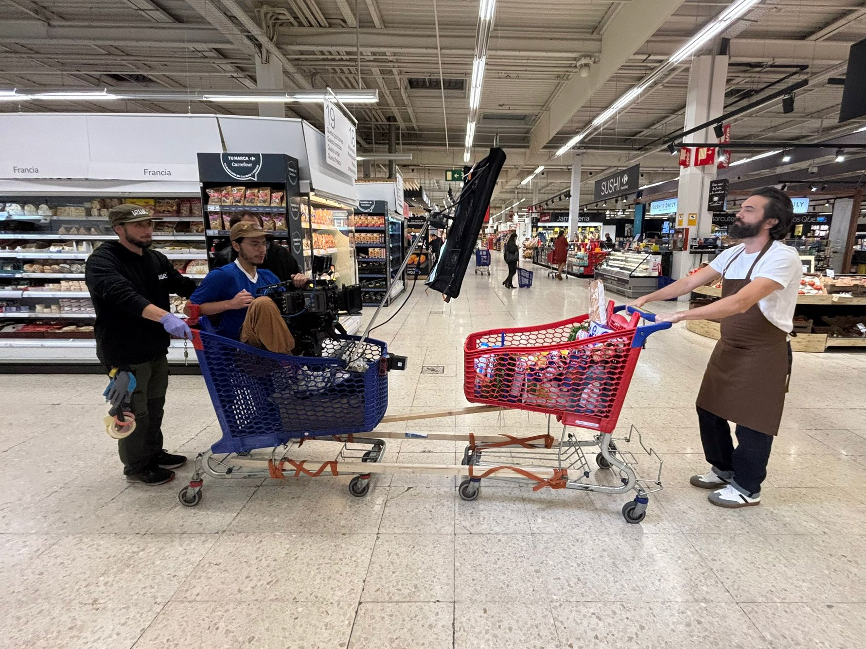 El siguiente fue otro muy divertido, que requirió mayor nivel de “shiittyrig”, queríamos generar un efecto de “snorry-cam” con todo el carrito de compras, por lo que la idea fue unir dos carros, uno frente al otro; en el primero me montaría yo, junto con la cámara y la iluminación, el otro funcionaría como “picture cart”.